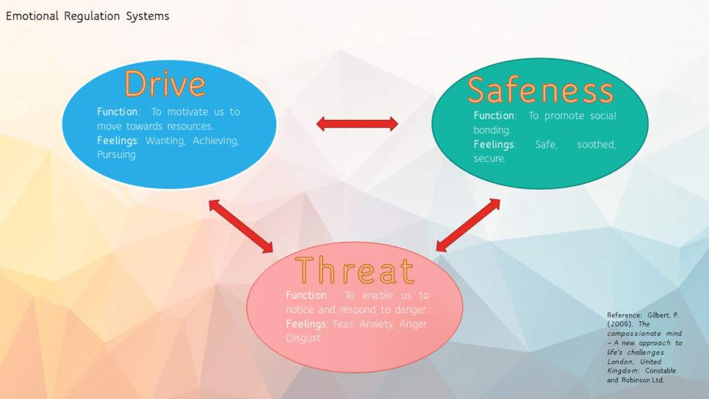 Although a simplification, this model shows us that there are three main emotional states that our body we find itself in some configuration of at any point in time:  Threat, Drive and Safeness.